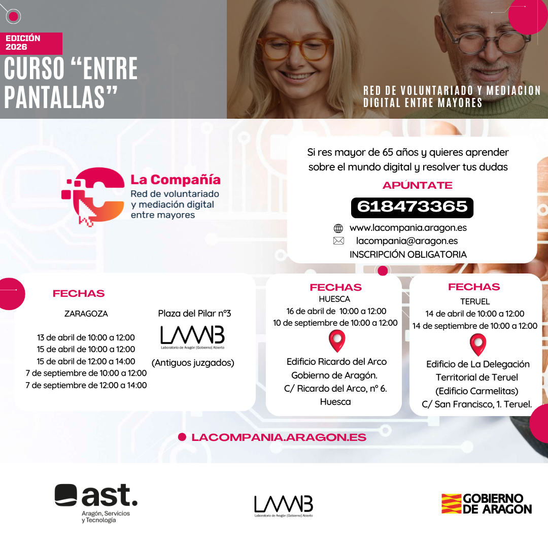 Aragonesa de Servicios Telemáticos (AST), en colaboración con el Laboratorio de Aragón Gobierno Abierto, pone en marcha por quinto año consecutivo “La Compañía”, una iniciativa de voluntariado y mediación digital dirigida a personas mayores de 65 años. El objetivo del programa es fomentar el desarrollo de sus competencias digitales y proporcionarles herramientas que les permitan desenvolverse con mayor autonomía y seguridad en la sociedad digital actual.